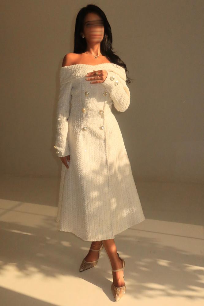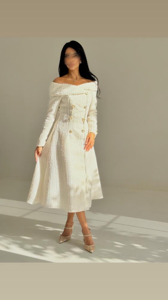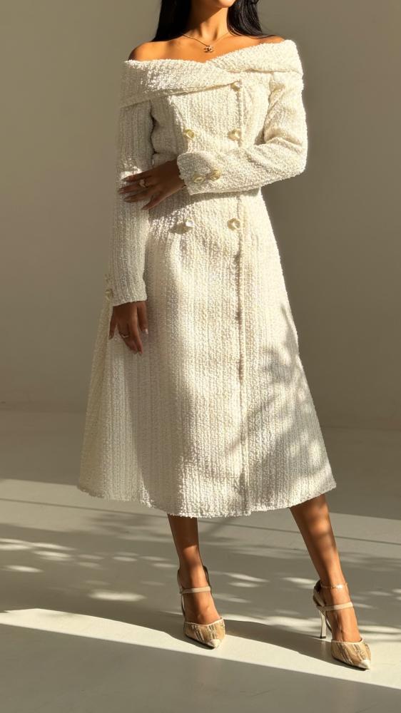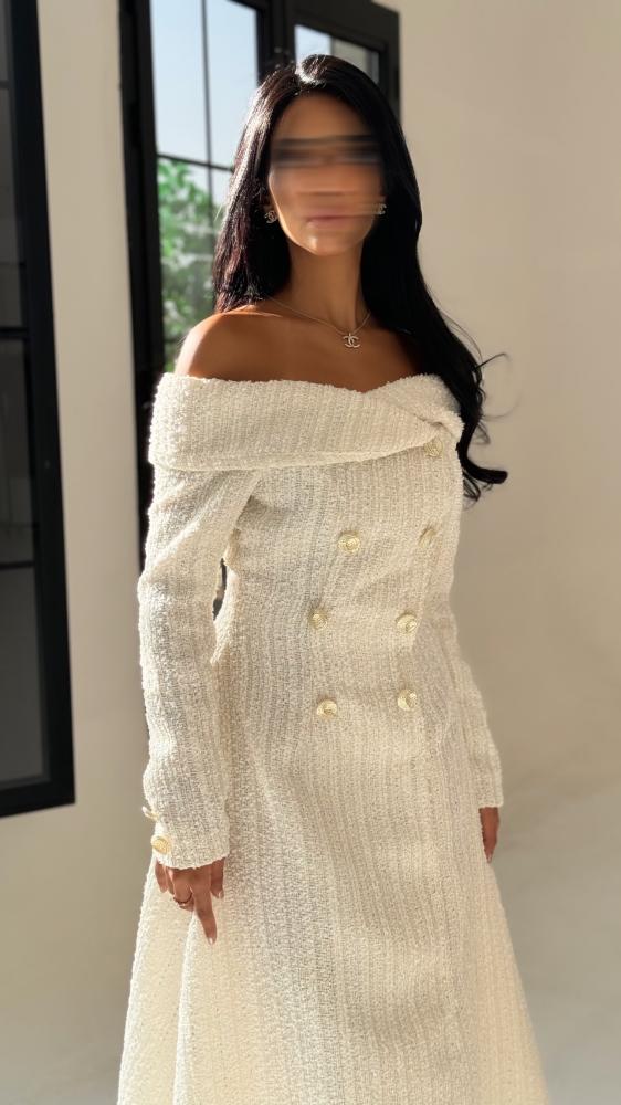 فستان "Via" الجديد منصوع من قماش ناعم تويد مع إضافة الأزرار الذهبيه ليضيف لمسة من الفخامة والأناقة.