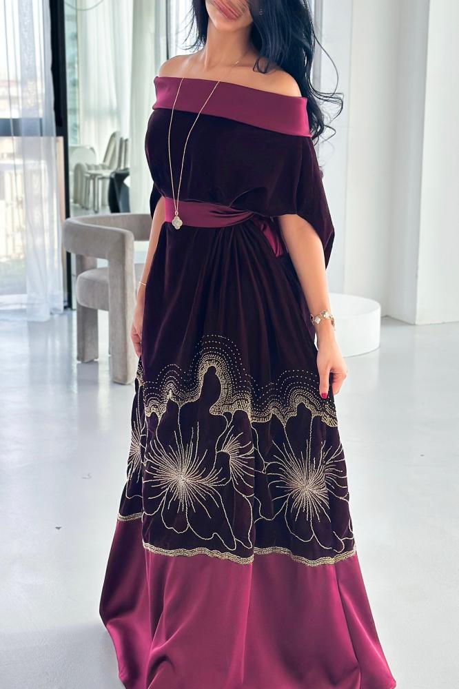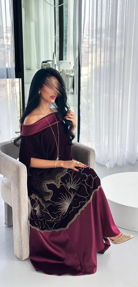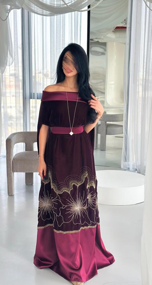 تأتي بتصميم انسيابي من المخمل الناعم، مع تطريز أنيق في الأسفل يضيف لمسة فنية فاخرة، وقماش حرير طبيعي يمنح الجلابية حركة ناعمة ولمعانًا راقيًا. يمكن ارتداؤها مع الحزام لإبراز الخصر أو بدونه لإطلالة أكثر نعومة وأناقة.