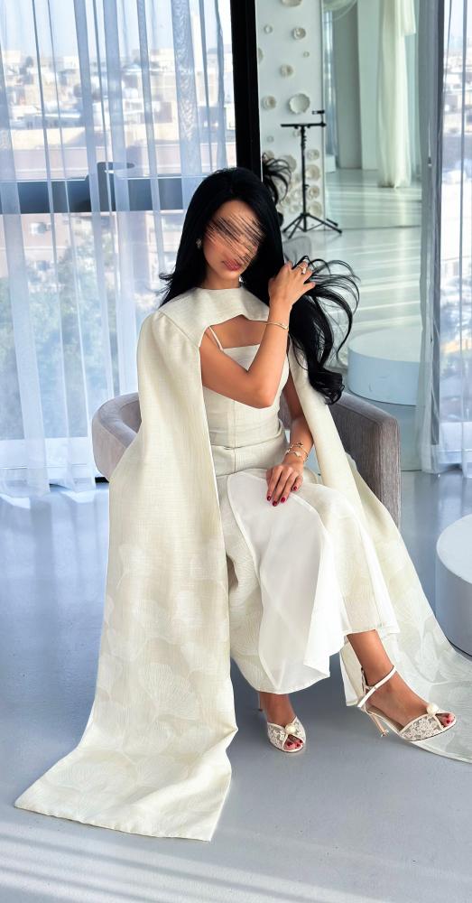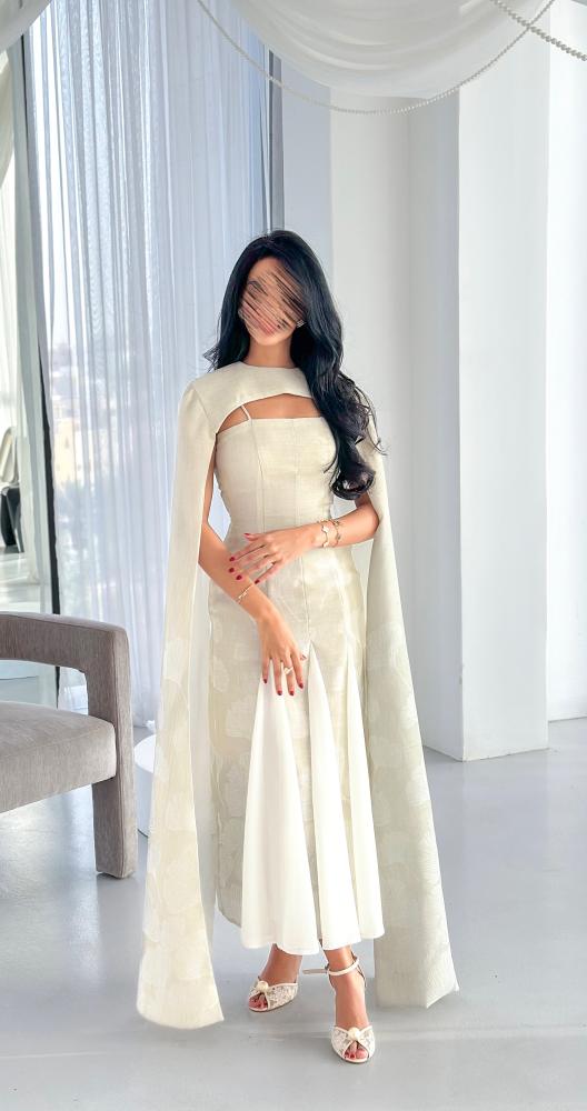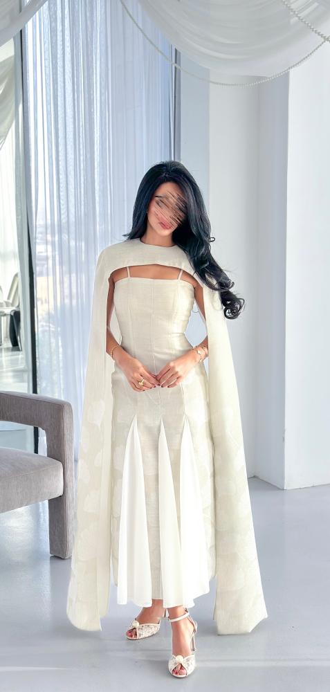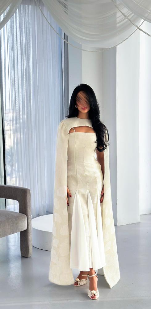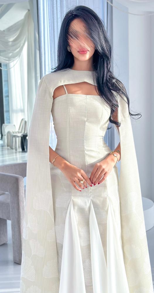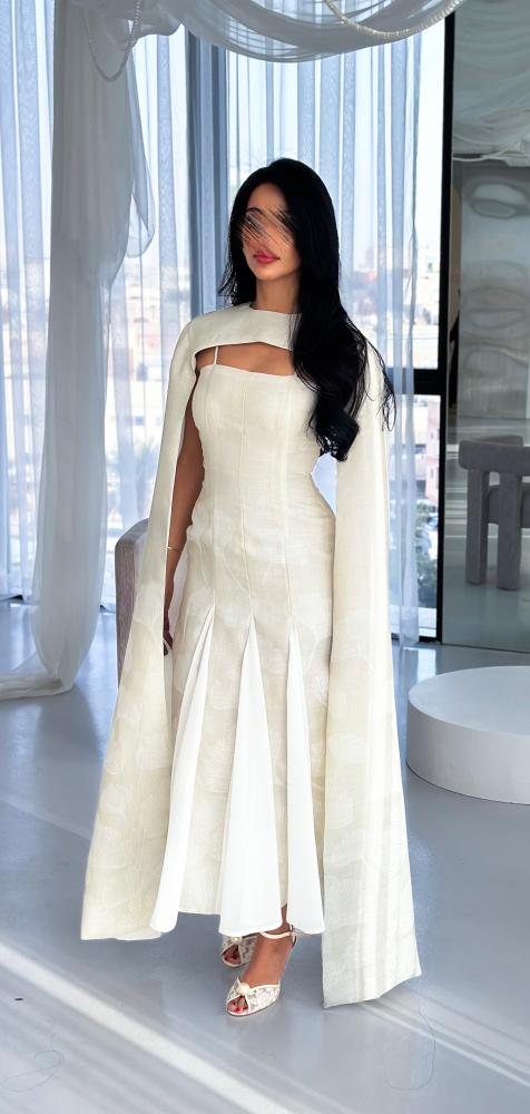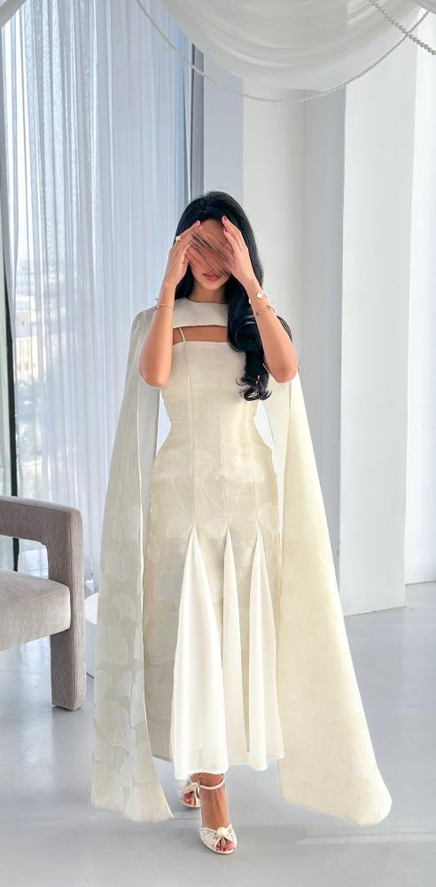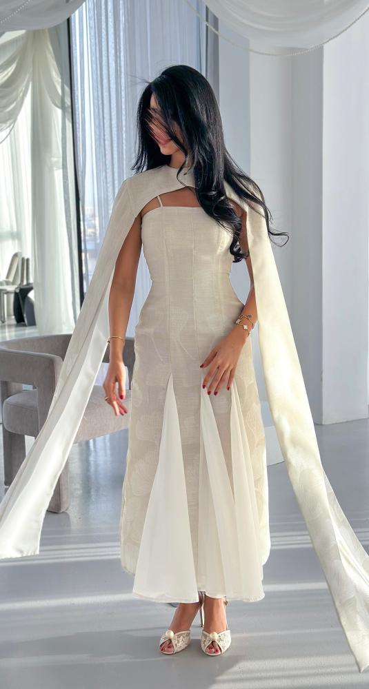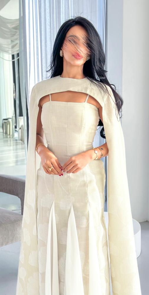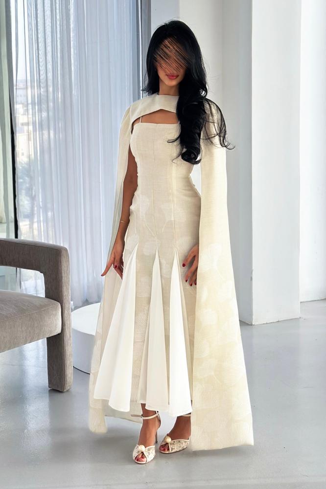 يأتي بقصّة محددة تبرز جمال القوام بانسيابية، مع تصميم فريد عند الصدر يضيف بعدًا عصريًا مميزًا. الأكمام الطويلة المنسدلة تضفي حركة ناعمة ولمسة درامية راقية، بينما تضيف القصّات السفلية المصنوعة من قماش الشيفون انسيابية خفيفة تعزز من فخامة الإطلالة. اللون العاجي الهادئ يجعل الفستان خيارًا مثاليًا للمناسبات الراقية والسهرات الخاصة.