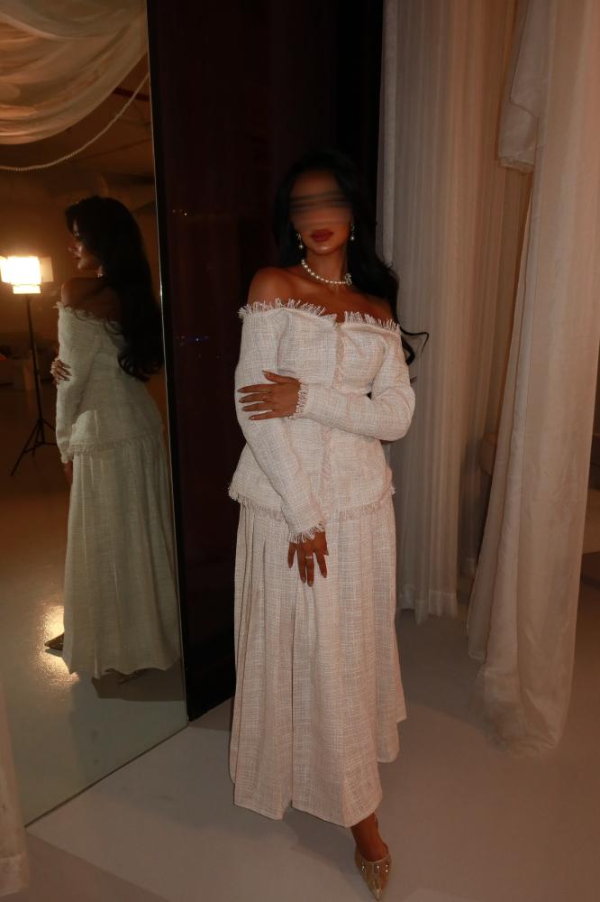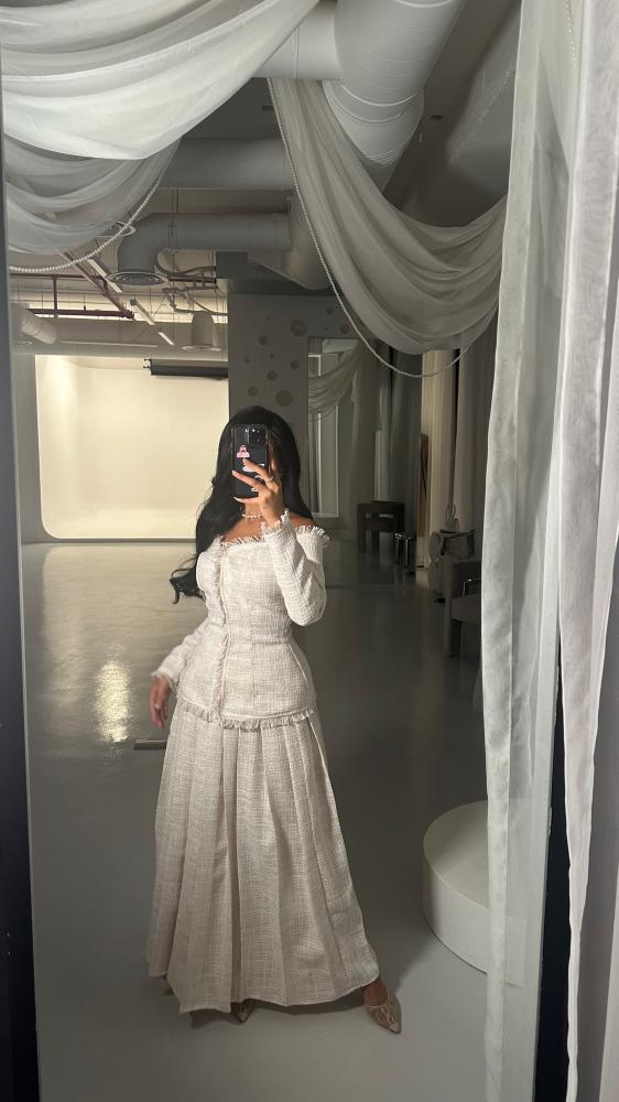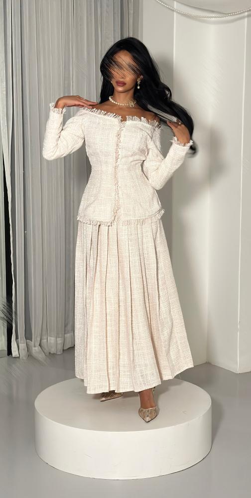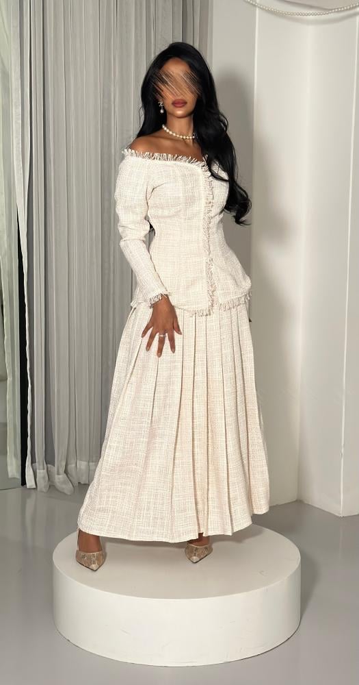 فستان شتوي أنيق بتصميم يجمع بين البساطة الراقية والطابع الكلاسيكي العصري. مصنوع من قماش تويد ناعم بلون عاجي و وردي هادئ يمنح لمسة دفء وأناقة تناسب الأجواء الباردة. يتميّز الفستان بتصميم قطعتين؛ جاكيت بأكمام طويلة بتفاصيل خيوط ناعمة عند الأطراف وقصّة محددة تبرز الخصر، مع تنورة طويلة بطيات انسيابية تضيف حركة فخمة وأناقة أنثوية متكاملة.