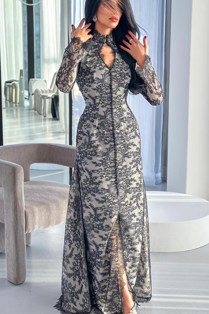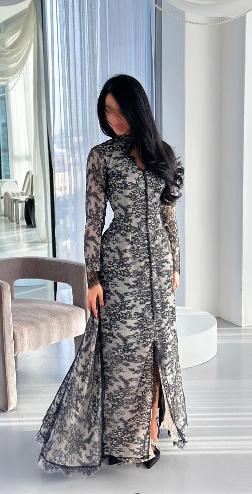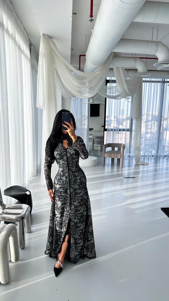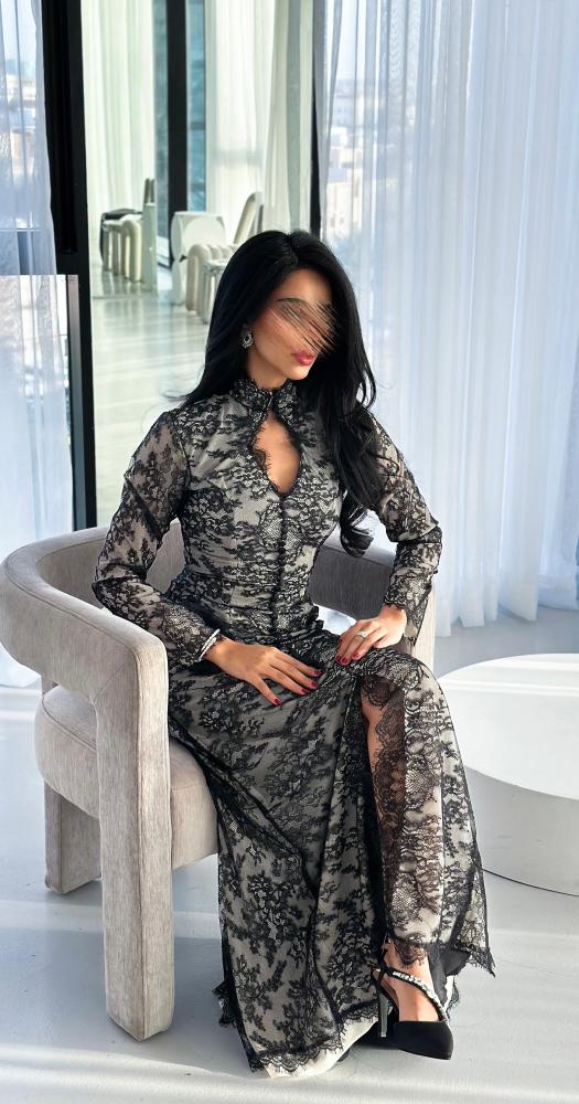 مصمّم بقصّة محددة تبرز جمال القوام، مع دانتيل راقٍ يغطي الفستان بالكامل ويمنح الإطلالة طابعًا أنثويًا فاخرًا، فيما يأتي الشيفون الداخلي ليضفي خفّة وانسيابية ناعمة مع كل حركة. فتحة الصدر الأنيقة والأزرار الأمامية تضيف لمسة فخامة، بينما يعكس التباين بين الدانتيل الداكن واللون الفاتح تحته حضورًا قويًا ومميزًا، مثالي للمناسبات الراقية والسهرات الخاصة.