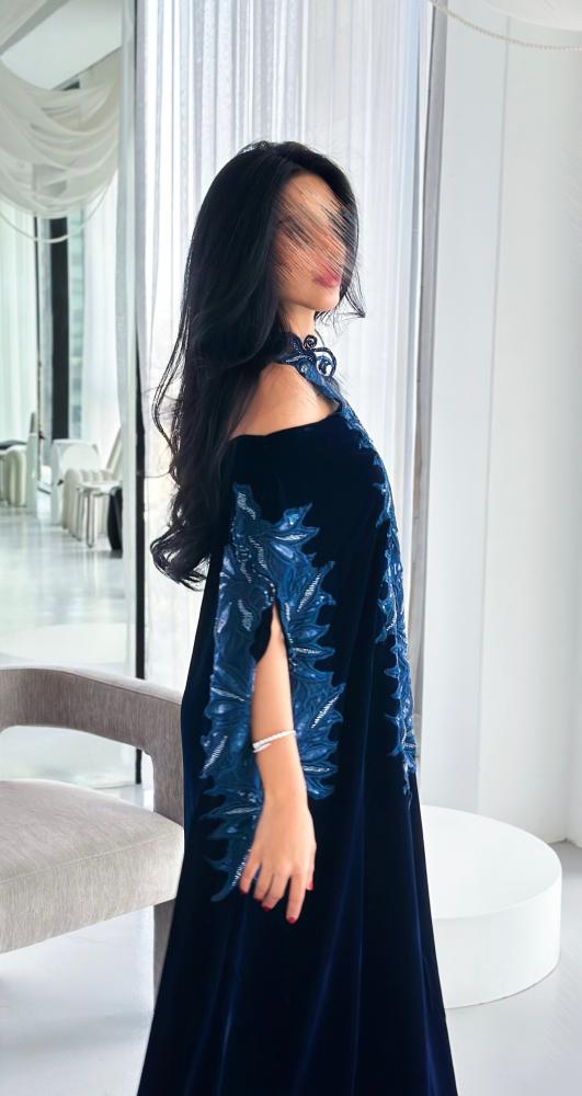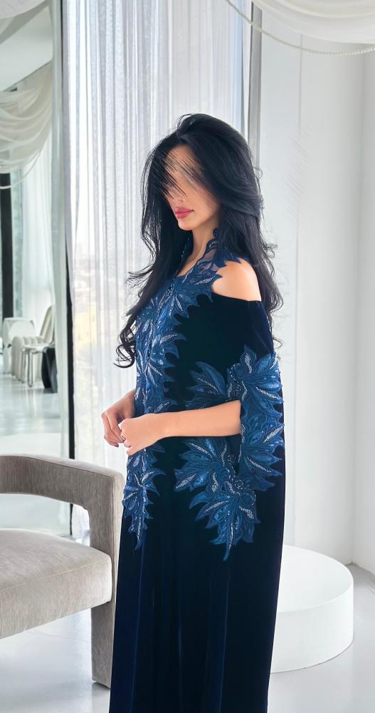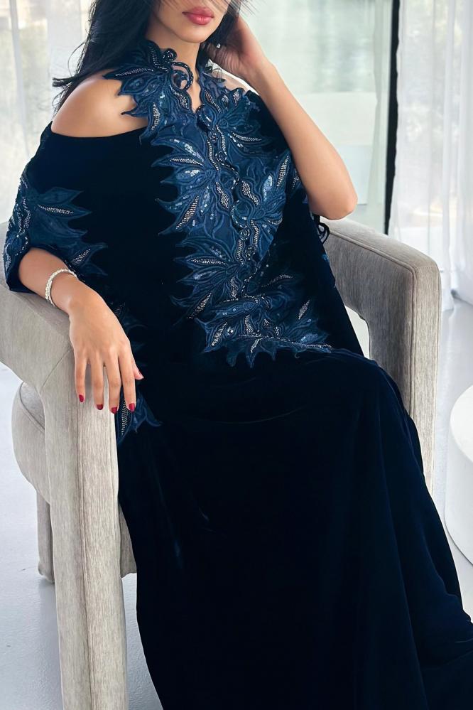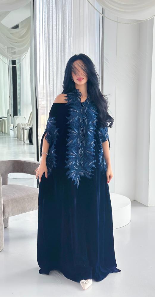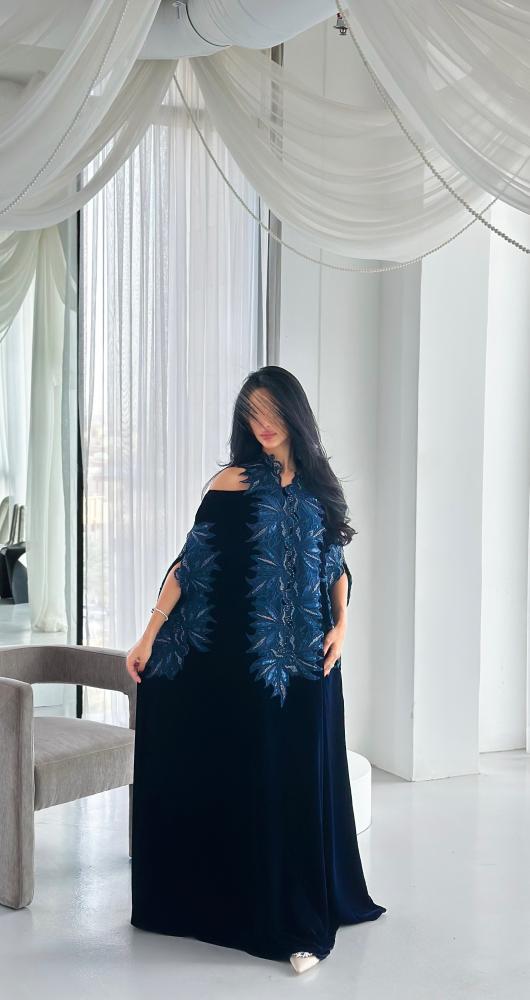 تأتي بقصّة انسيابية من قماش مخمل فخم يمنح الإطلالة نعومة ولمعانًا راقيًا، مع تطريز متقن بلون أزرق غني ينسدل على الصدر ليضفي حضورًا لافتًا ولمسة فنية أنيقة. يبرز اللون الكحلي عمق التصميم ويجعل القطعة خيارًا مثاليًا للسهرات والمناسبات الراقية.