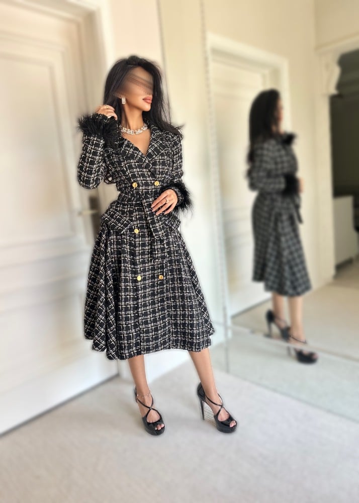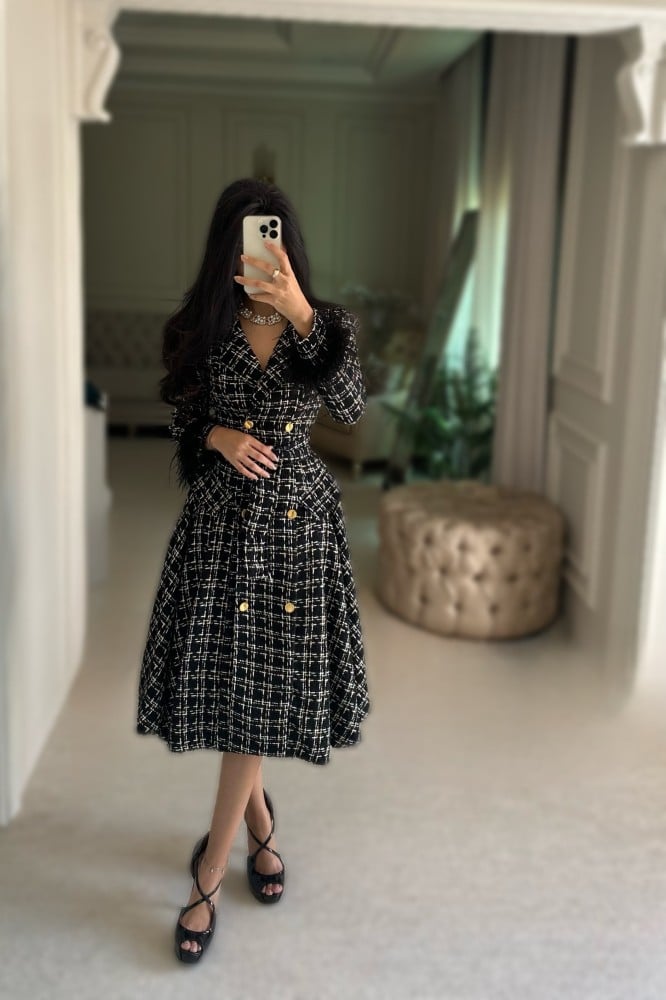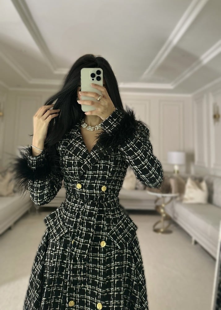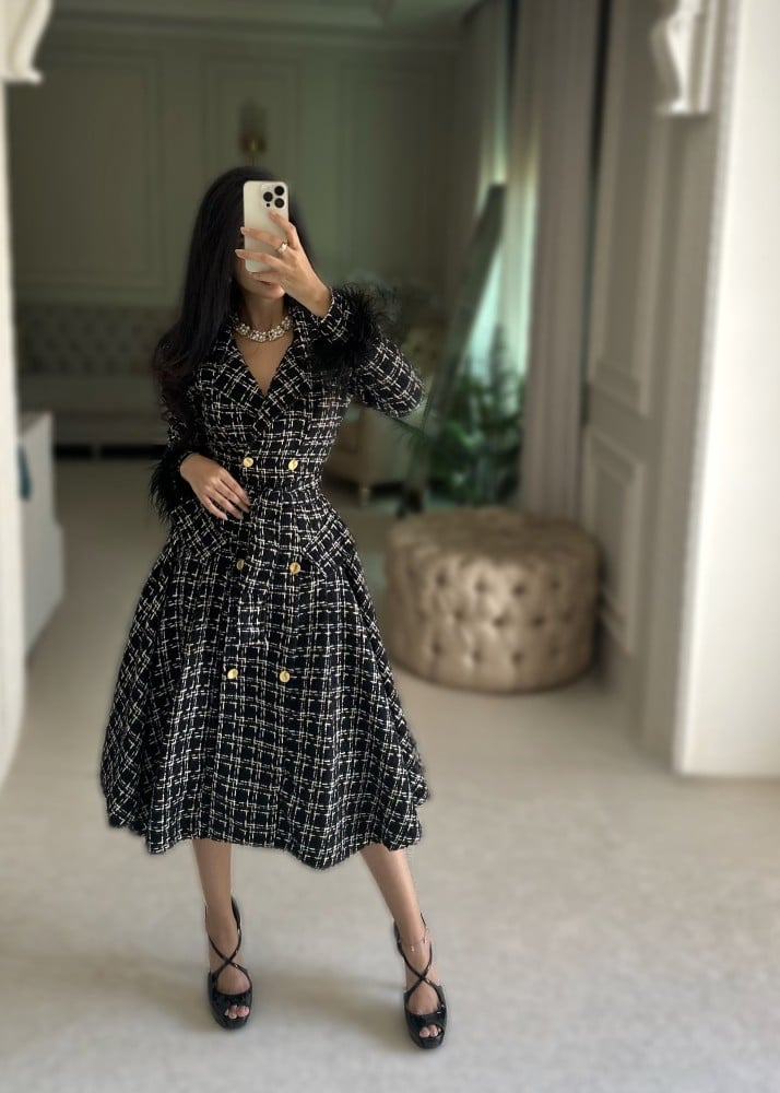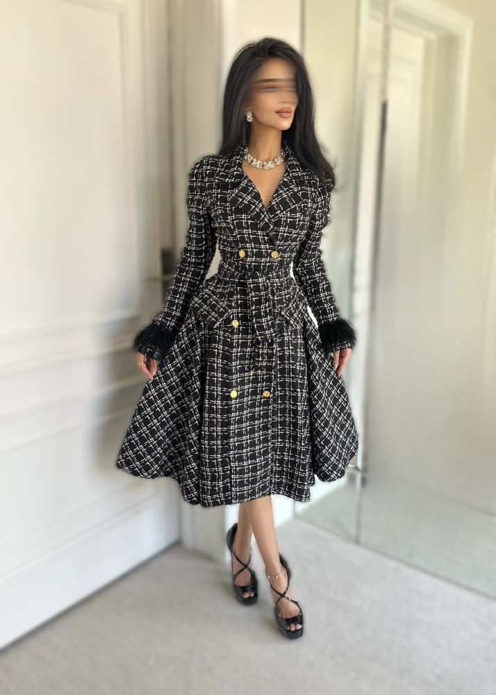 فستان “The Groves” يجمع بين روعة قماش التويد الشتوي وفخامة الأزرار الذهبية، مع قصة مميزه لتبرز مظهر الخصر بشكل اجمل. اللمسة النهائية للريش على الاكمام تضفي عنصرًا جذابًا وفاخرًا يكمل سحر هذا الفستان.