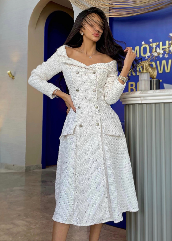 يرجى التاكد من المقاس بالرجوع الى دليل المقاسات في القائمة الجانبية و يقاس بالانش.نوع القماش: شانيل (تويد)طول المودل: 160 سممقاس المودل: XS