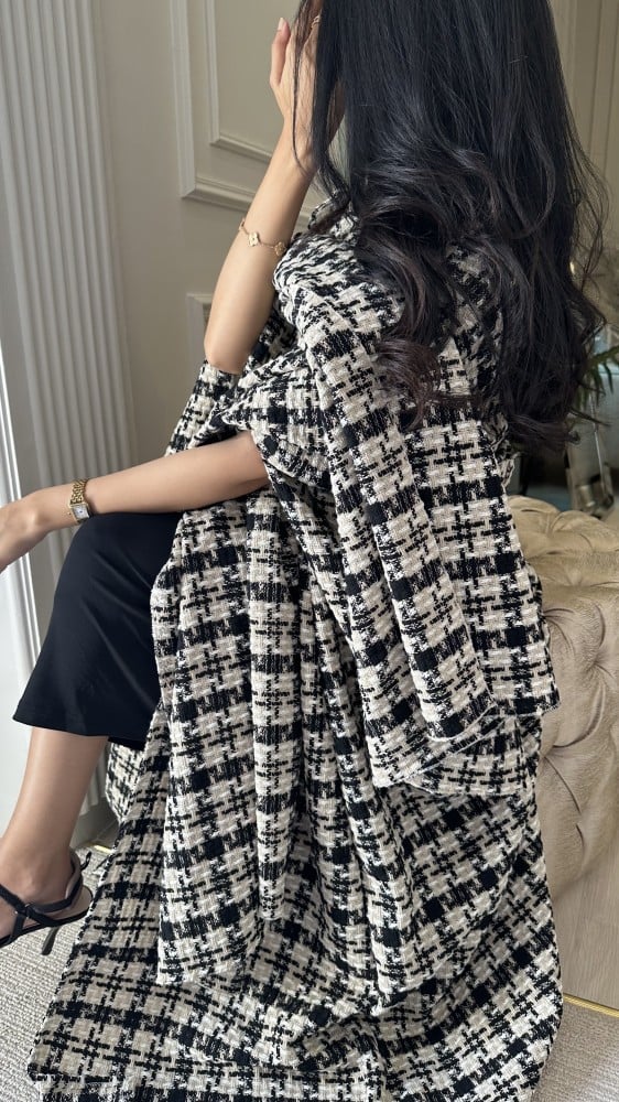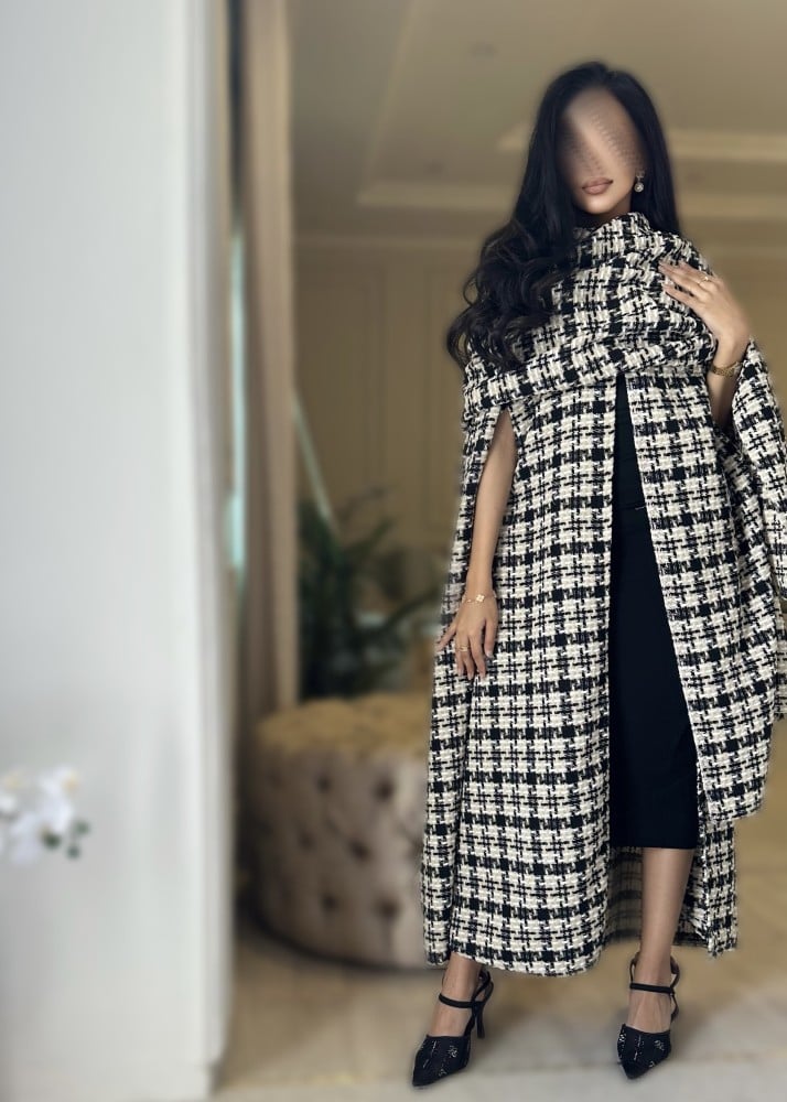 “اسما” هو كوت شتوي أنيق بقصة كيب مصنوع من قماش التويد الشتوي الفاخر، الذي يتميز بخيوط سوداء وبيج تضفي لمسة من الأناقة والفخامة على التصميم. يتميز هذا التصميم بالشال المنفصل بالاعلى حيث يوفر الدفء والمنظر العصري الأنيق الذي يضيف لمسة من الجمال والأناقة إلى التصميم.